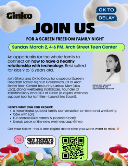 Greenwich-based non-profit OK to Delay is launching its first family-focused event, Screen Freedom Family Night, in partnership with digital wellness pioneer Larissa May. The event, set for Sunday, March 2, from 4:00 to 6:00 p.m. at the Arch Street Teen Center, will offer an engaging evening designed to foster healthier relationships with technology for children and parents alike.