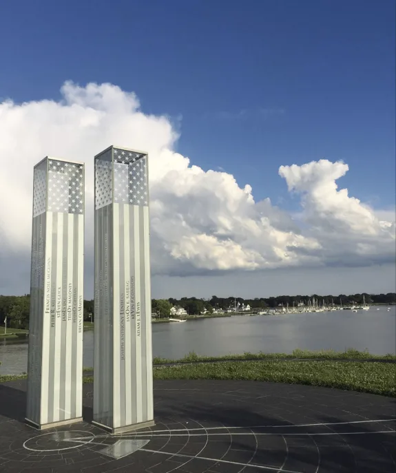 When the memorial was unveiled in 2015, Sentinel reporter Tim Dumas described its distinctive features: the twin towers of glass rising 12 feet above the harbor, and a spiral walkway designed according to the Fibonacci ratio, the mathematical sequence found in seashells and sunflowers. The pathway leads visitors toward the towers, creating a natural rhythm of reflection.