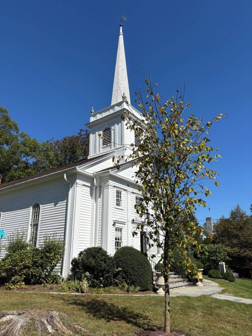 Last Sunday, at the memorial service for John Conte, a noted embracer of trees, brought new life in the replacing of a lost elm tree long heralded before the First Church of Round Hill with a new Valley Forge Elm tree with its plaque to read, “In Memory of John R. Conte, Jr., 1959-2025.”