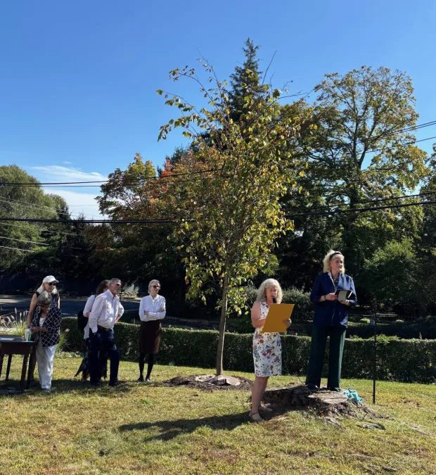 Standing beside that young tree acquired by the Sam Bridge Nursery, before a gathering of family and friends spoke Leslie Lee who had stepped up as interim president of the Greenwich Tree Conservancy (GTC) with the sudden death of Conte in April, his having become GTC director only this January. Lee thanked First Church for “their gracious hosting” of the memorial service. First Church indeed was the site of the marriage of Conte and his wife Kim.