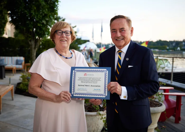 At Home then honored The Retired Men’s Association of Greenwich (RMA) for the many years of programs provided and services given by its members to the community. Last year, the RMA celebrated its 70th anniversary of providing fellowship and camaraderie among retired men in the greater Greenwich area. The RMA is best known for its world-class speaker’s program held each week from 11:00 a.m. to 12:00 noon in the Christ Church parish hall. The speaker series covers a vast number of speakers from around the country who present topics that help members keep up on issues of international, national, State and local concerns. For example, recent speakers spoke on varied topics including artificial intelligence (AI), cryptocurrency, Congressional legislative actions, the condition of Interstate 95, and on-line betting. RMA members volunteer throughout the community and regularly provide services to almost thirty non-profits in the Greenwich area. Beth Krumeich announced that At Home was delighted to give the honor to David Michonski, current president accepting on behalf of the RMA, for the many years of programs the RMA provided and services given by its members to the Greenwich community.