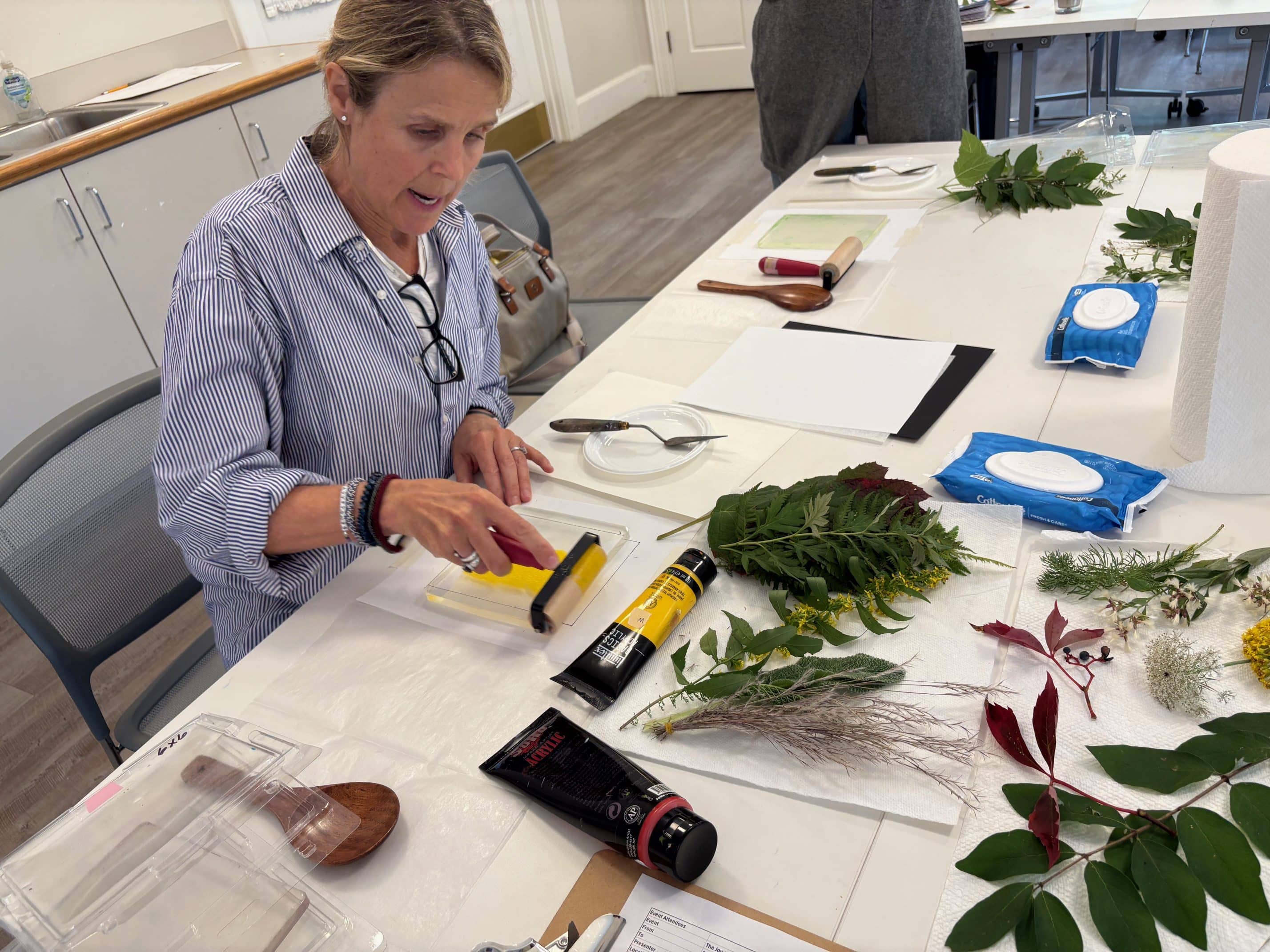 With her guidance each table would be filled with colorful botanical prints, some showing stenciled silver leaves, some with multiple color variations. But the two-hour session was coming to a close, and Wendy next to me was leaving, with her impressive spread of prints. “This has been wonderful and exciting,” she tells Mary, “Thank you so much.” Agreed! Thank you, Mary!