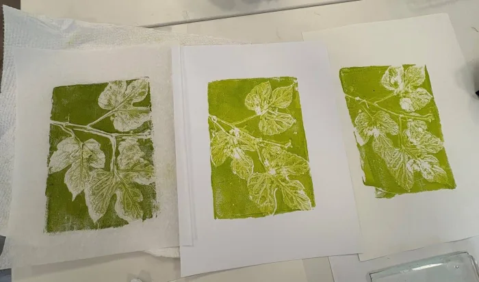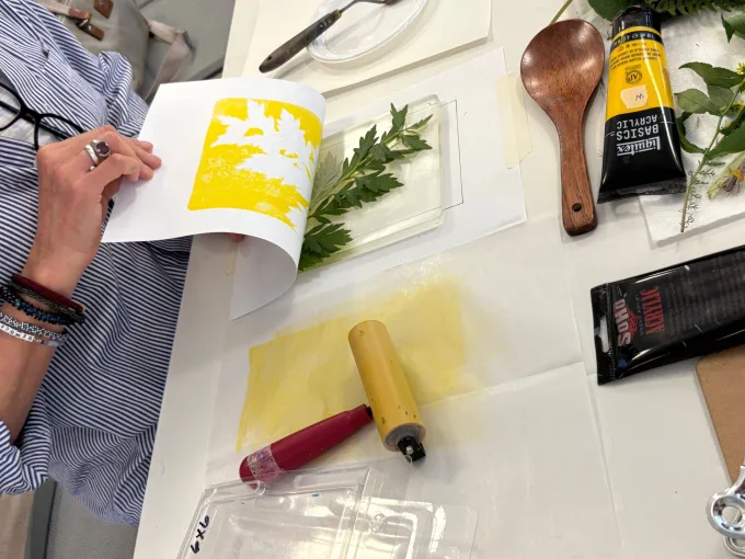 Onto the next table, Mary brings a set of stencil designs we can also use on our gel plates, and she points to a purple print of hers attached on the wall. “So, this purple one is a ghost print. It really shows it’s the positive, not the negative of the stencil.” To demonstrate, she chooses yellow paint to make the botanical print. “I roll the yellow on; I put the plant on top and then I take away the print right?” She then places the print on the imprinted gel. “It’s hard to burnish it when there’s paint because there’s friction there. I’m holding it down really, really, hard.” The result is a most colorful and evocative ghost print.