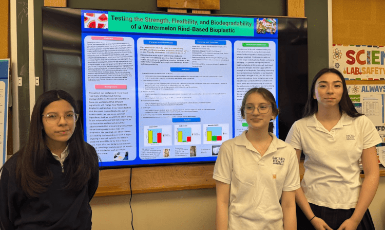 As 8th graders, Stephanie Galvez ’29, Bonnie Ukperaj ’29 and Mia Cartagena ’29 created the project “Testing the Strength, Flexibility, and Biodegradability of a Watermelon Rind-Based Bioplastic” for the Connecticut Science & Engineering Fair (CSEF). Their innovative work earned them a finalist medal and the opportunity to advance to the next round of judging.