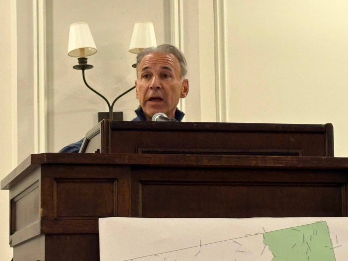 Last up was long-serving Town Assessor Lauren Elliot. “I’m here to talk about the 2025 reevaluation… And to give you some insights into property taxes here.” Her handouts were passed around. “You have $29.8 billion of residential value in town. You have 5.2 billion in commercial value in town. That’s our grand list that comes to a hundred percent value of $52 billion. It is by far the largest grand list in the state.”