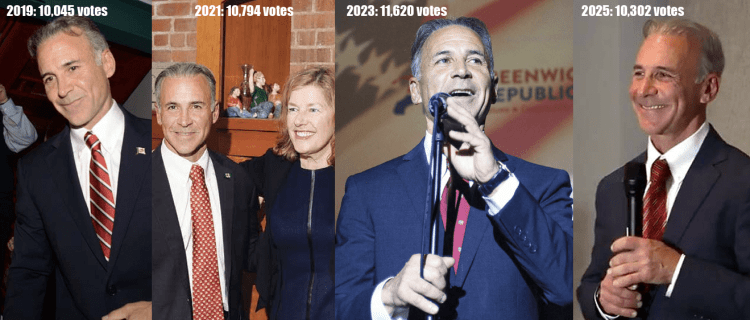 Camillo’s performance over four election cycles has been remarkably stable – 10,045 votes in 20219, 10,794 in 2021, a surge to 11,620 in 2023, and 10,302 this year. Despite a challenging year for Republicans regionally, Greenwich once again proved the outlier. “Even though it was not good here, it still outperformed all the other Republican towns in the region,” Camillo said. “There were lots of regional and national trends at play that contributed to a really horrible Republican performance all around, but Greenwich stood apart.”
