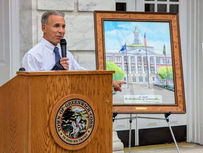 Greenwich Town Hall marked its 100th anniversary with a brief outdoor ceremony on Wednesday. Originally built in 1925 as Greenwich High School, the building served students until 1970 before becoming Town Hall. The event, led by First Selectman Fred Camillo, featured a new portrait by resident Gary Calabro and recognized staff for maintaining the building and upcoming accessibility improvements.