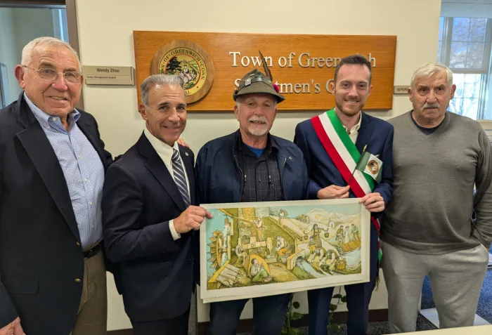Mayor Ivan Minella of St. Giustina Belluno, Italy, visited Greenwich Town Hall for a cultural exchange with First Selectman Fred Camillo. The meeting, arranged by resident Graziano Bortot, focused on local governance and shared community ties between Greenwich and Italy. Mayor Minella presented a map of his town, which is near Venice and preparing for the upcoming Winter Olympics.