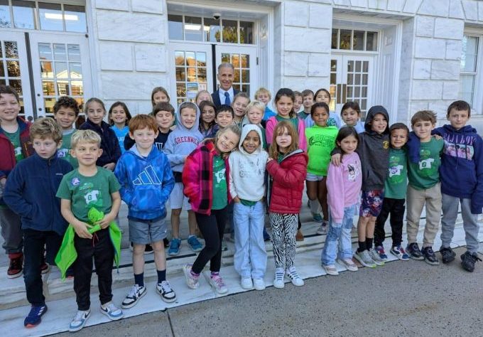 Second graders from Glenville School visited Town Hall in two groups to learn about how Greenwich’s local government operates. They toured the Town Hall Meeting Room to see the early voting setup and received “I Voted” stickers, then visited the Town Clerk’s records room to learn about record-keeping. The visits were organized with help from teachers, election staff, and Town Hall employees. Photo credit: First Selectman Camillo’s Community Connections