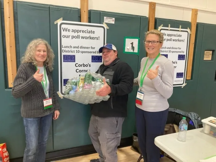 Participating restaurants included Constantino’s Pizza & Ice Cream, Planet Pizza, Little Pub, Garden Catering, The Makerie, and Corbo’s Deli, with Love You A Latte providing coffee and baked goods for early voting. “Everyone really appreciated the effort,” DeCaro said. “Even with a few lunchtime hiccups, the enthusiasm from our community partners was outstanding.” Dinner deliveries ran smoothly, and photos captured smiling poll workers posing with delivery drivers and “thank you” signs from local sponsors.