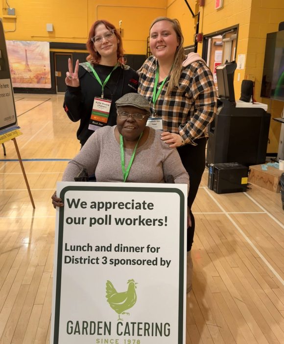 Participating restaurants included Constantino’s Pizza & Ice Cream, Planet Pizza, Little Pub, Garden Catering, The Makerie, and Corbo’s Deli, with Love You A Latte providing coffee and baked goods for early voting. “Everyone really appreciated the effort,” DeCaro said. “Even with a few lunchtime hiccups, the enthusiasm from our community partners was outstanding.” Dinner deliveries ran smoothly, and photos captured smiling poll workers posing with delivery drivers and “thank you” signs from local sponsors.