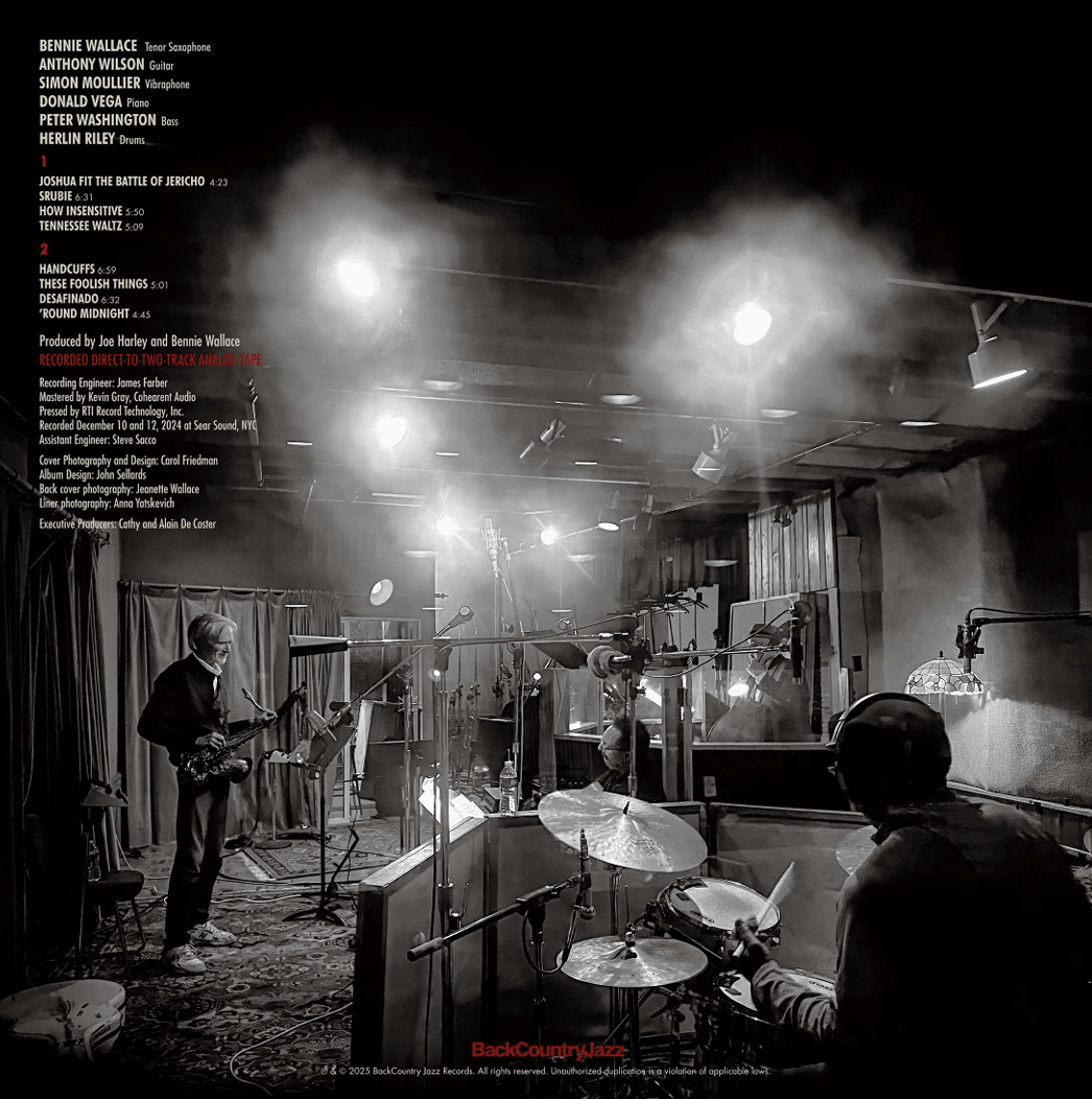 Is he still composing music? “Well, not all the time,” he tells, “But I’ve got a lot of tunes I’ve written over my career, tunes I wrote for jazz records and for movies… all that to draw from when we do concerts.” But he has composed two new tunes, circa 2024. “They’re on the album.” Wallace is referring to his just produced first BackCountry Jazz record album. He displays its standout back cover showing him with his tenor saxophone and fellow musicians recording in a Manhattan studio. Evident in the front is drummer Herlin Riley.