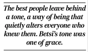The best people leave behind a tone, a way of being that quietly alters everyone who knew them. Betsi’s tone was one of grace.