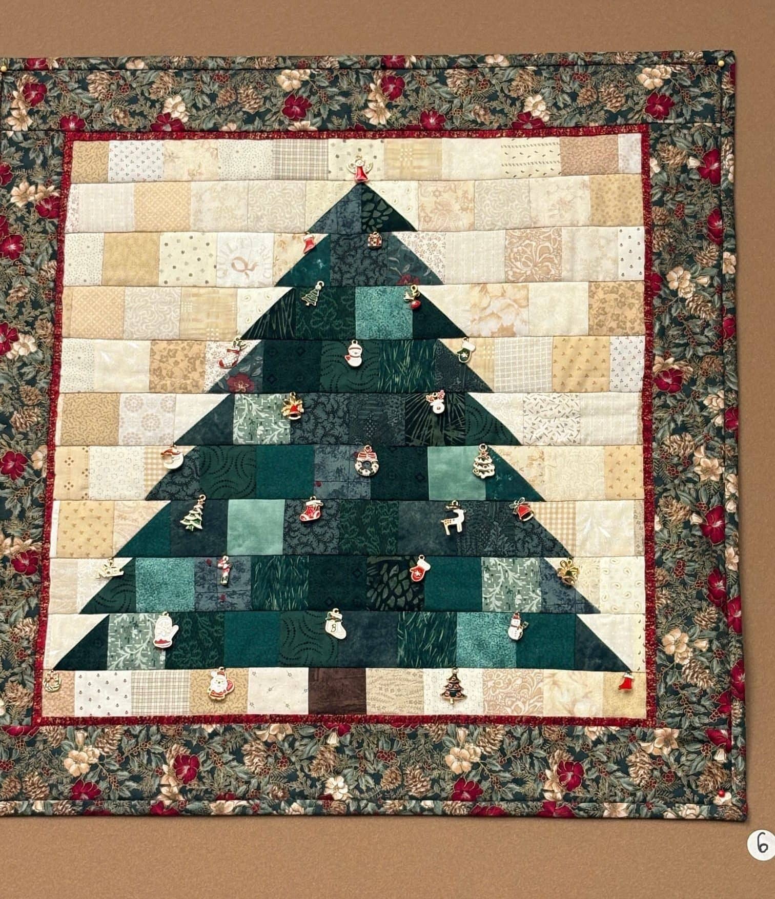 Beazie Larned, as one of 27 quilters exhibiting, pointed to the range of sizes. “So, there are eight quilts hanging from the rafters,” with some sizeable for bed quilts, some smaller for wall hangings, and one that is “lap size…it’s great for cuddling up on a sofa.” Larned has made a colorful green “O Christmas Tree” with tiny ornaments attached over it. She places it above her kitchen fireplace at Christmas time.