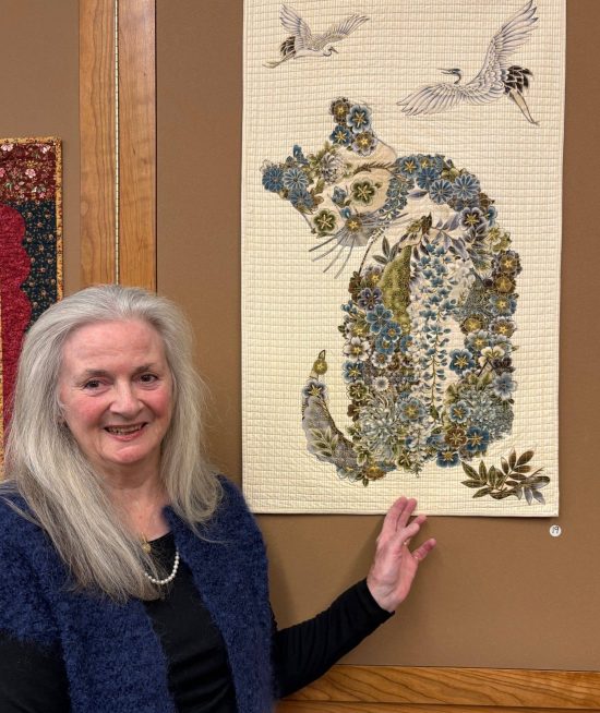 She points across to an artful “collage” quilt that has a cat shape. The quilter steps forward, introduced as Barbara Hicks. Her quilt is named “Princess Sophie” for her “beloved cat Sophie who lived to be 24 years old.” She had sought out special fabric with flowers to cut out, and crane decorated oriental panels, for those cut out cranes to be flying over Princess Sophie.