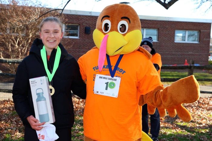 The Turkey Trot once again celebrated athletic achievement across all age groups. In the 5K, top male and female overall finishers (Kyle Grieve, Riverside, CT, 15:20.3; and Zara Geddes, Greenwich, CT, 18:36.2, respectively) were recognized. In the 1 Mile, Owen Harvey (from Greenwich Country Day School) and Sadie Mayhall (from Eastern Middle School) were the first male and female finishers.