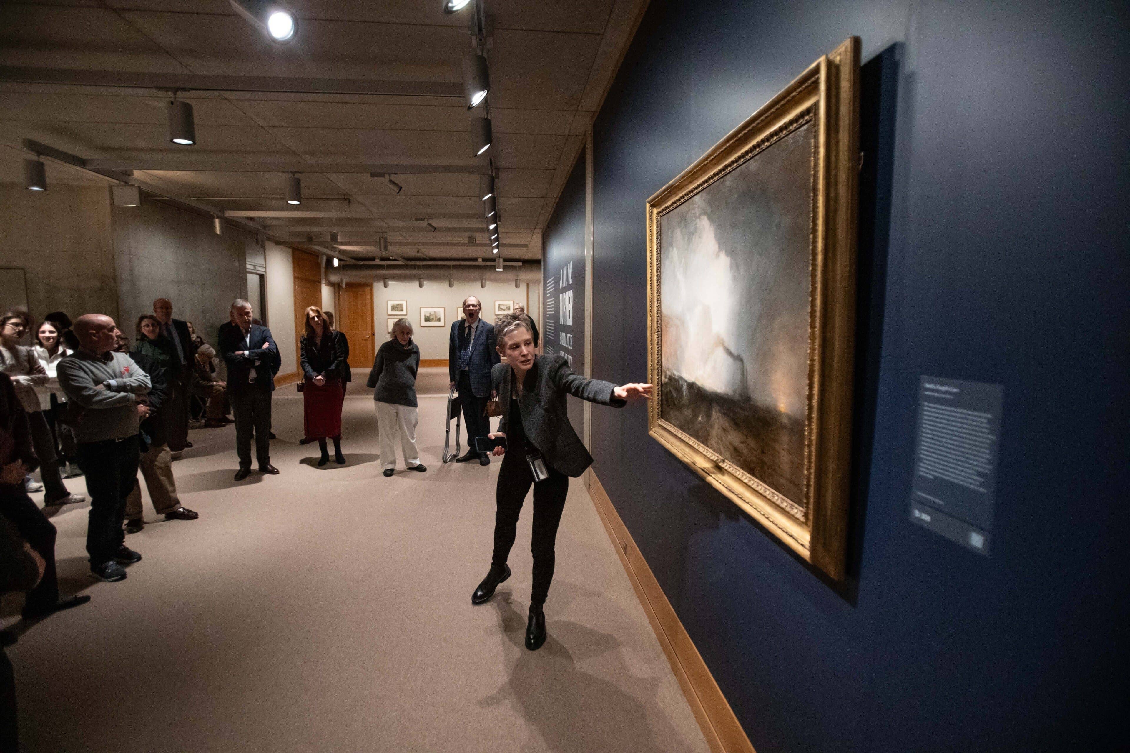 Enrolled in London’s Royal Academy of Arts at age 14, Turner had learned by age 18 “the accurate representation of architectural details and a highly systematic approach to rendering, form and color,” told Lax. “All these traits are readily in evidence in the earliest examples of his finished watercolors in the YCBA’s collection.” A favorite early watercolor of hers is of “St. Augustine’s Gate “in “the ancient cathedral city of Canterbury, painted in 1793… He was born in 1775…so we’re talking about somebody just emerging out of his late teens who had just finished his artistic training and was already at the level of skill and capability that he could create these really subtle renditions…. He’s already starting to think about how to romanticize the elements.”