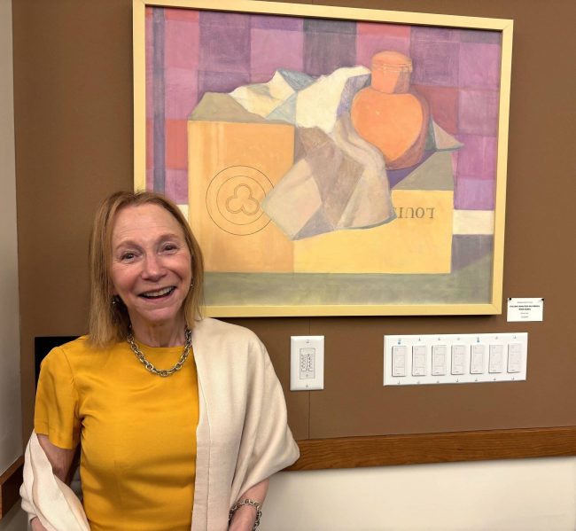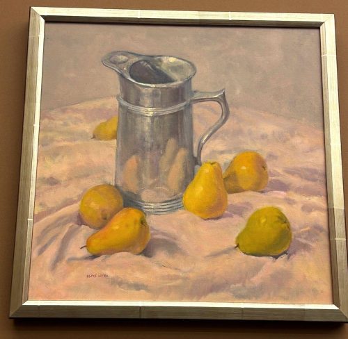 Other works – still life’s featuring silver pitchers and copper tea kettles had especial glows about them. She noted, “My art is primarily realistic with occasional abstract infusion. I love geometry; thus, squares and diamond shapes sometimes appear.”
