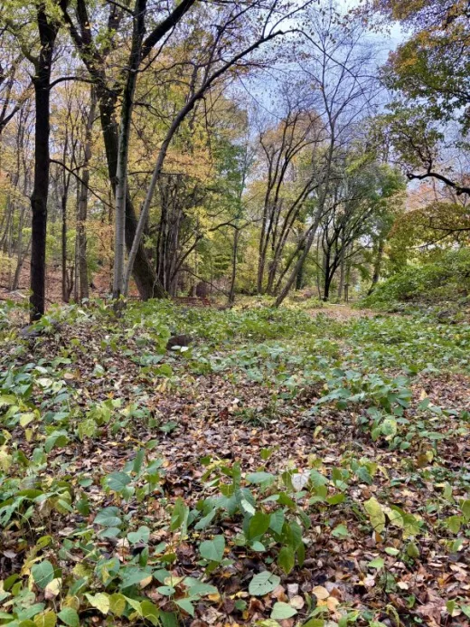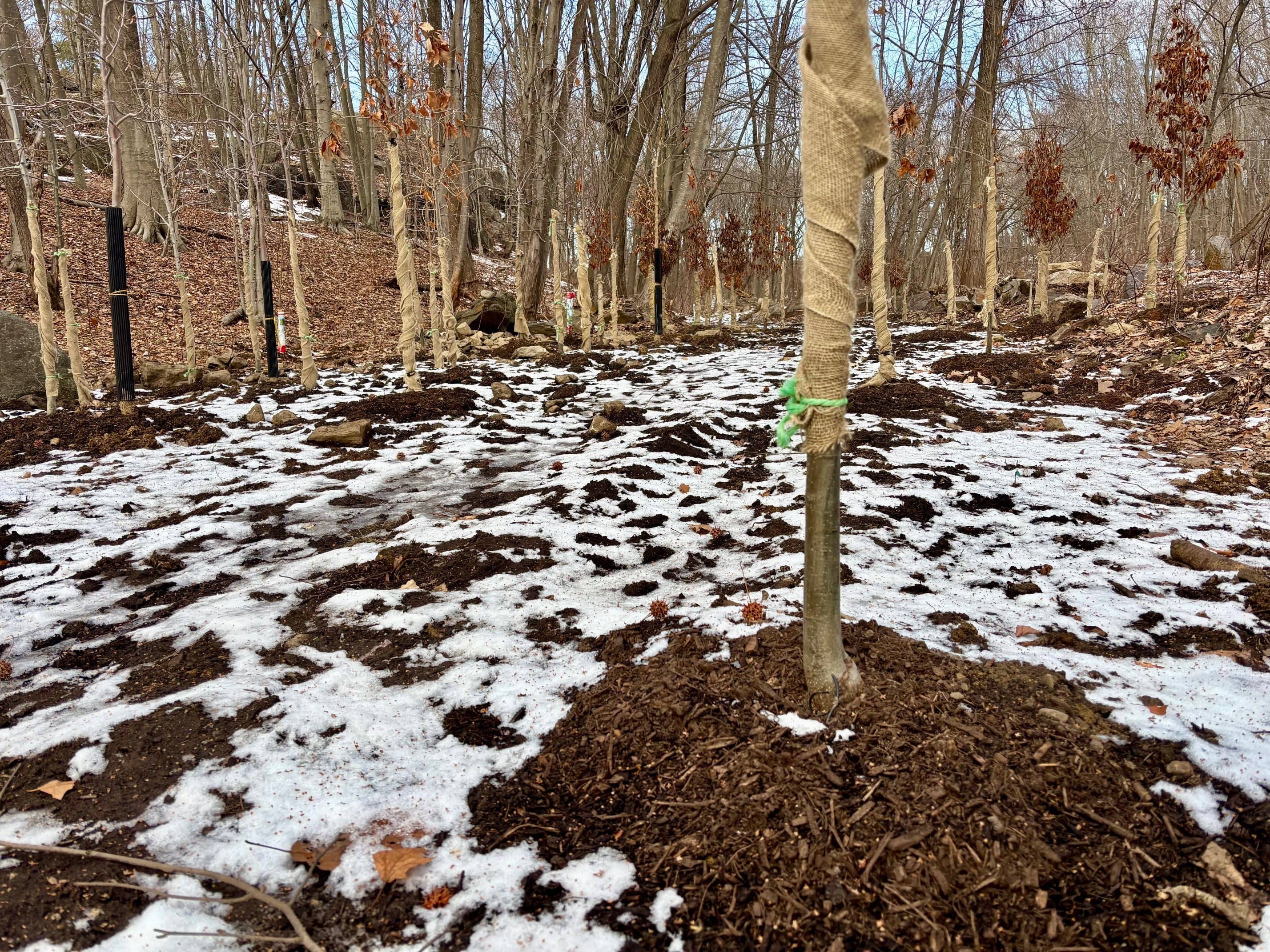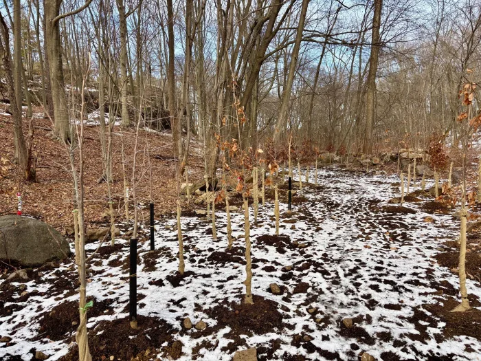 Following the invasive removal, the Greenwich Tree Conservancy planted an initial 70 trees throughout the sanctuary, with additional plantings planned for the spring. The trees include a diverse mix of cold-hardy native species commonly found in Connecticut forests, such as American hornbeam, tulip tree, and five species of oak.