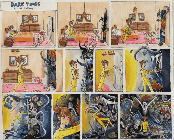 Juliet Chattaway’s Dark Times, meanwhile, moves decisively into narrative. Told through comic-style panels, the piece follows a young girl as her bedroom—warm, contained, familiar—gives way to a chaotic outside world populated by tentacled forms, warning symbols, and looming threats. The style is vivid and animated, but the emotional arc is controlled. Fear accumulates slowly. The work never tips into melodrama.