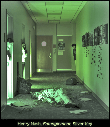In Entanglement, which earned a Silver Key, Henry Nash stages a tense hallway scene bathed in green light. A figure lies on the floor amid scattered leaves and papers, while others peer out from doorways. The narrative is implied but unresolved, and that ambiguity gives the image its charge. It feels cinematic without feeling staged, unsettling without being explicit.