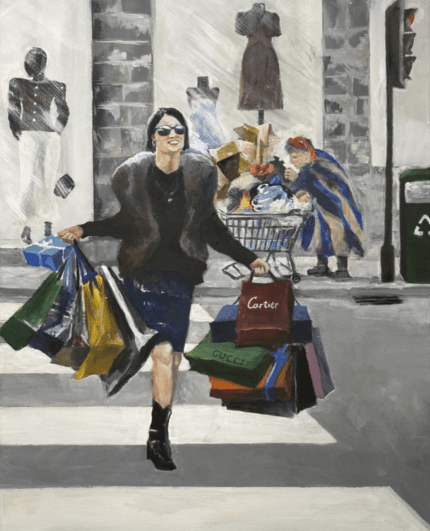 In Juliet Chattaway’s Next Stop, a subway car opens its doors and everything else recedes. A child stands alone at the threshold, briefcase in hand, lit from behind in a wash of amber. The adults around him barely register—faces angled down, bodies absorbed into the familiar choreography of a commute. The moment feels suspended, as if the train has paused not just between stations, but between ways of moving through the world.