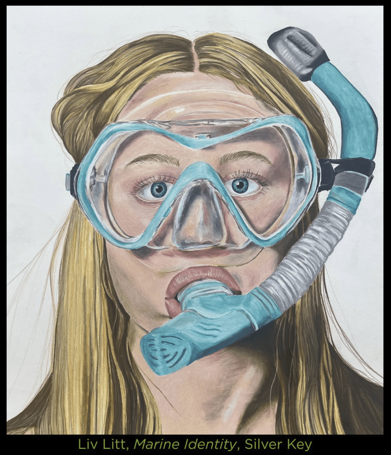 Several of the honored works grapple with identity by playing with distance and distortion. Liv Litt’s Marine Identity (Silver Key) presents a close-up portrait of a girl wearing a snorkel mask, her eyes enlarged and refracted through plastic and glass. The effect is both playful and disorienting, raising questions about how we see ourselves through layers—of environment, of expectation, of performance.