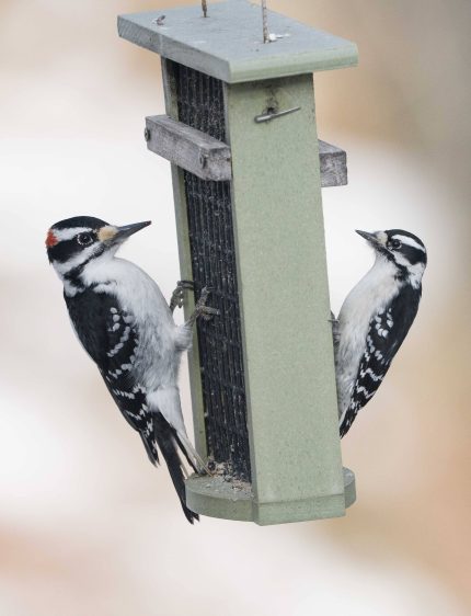 In her captures Melissa had worked long to find the perfect image that shows the size difference between a Hairy woodpecker’s beak and a Downy woodpecker’s beak relative to their heads, “because these birds are so hard to tell apart from one another when they’re not next to each other… they’re always moving so fast and I wanted to get them perfectly aligned.” That moment came with both coming to her suet feeder.