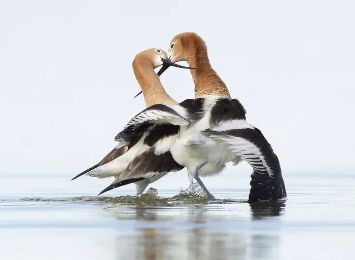 Melissa’s focus would move to target “a particular species in a particular place across the country, usually in a wildlife refuge.” In the Prairie Pothole Region in North Dakota, she found nesting Western Grebes. “With my 600mm lens and teleconverter,” she told, “I approached very slowly… I was able to capture their natural behavior, nest building, and chicks riding on the parents’ back…” Then in Montana at the Bowdoin Lake National Wildlife Refuge, she was able to capture the mating movements of a pair of American Avocets – her favorite shorebird. “They have this elaborate mating ritual… This to me is so beautiful and romantic – I’m always trying to capture this moment.” After mating, the male “puts his wing over the female and for a split second they cross bills and you have to be very fast…that crossing of the bills is just so poetic.”