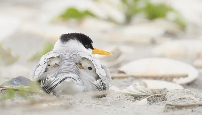 And on those beaches, she encountered a wonder with a Least Tern, her favorite tern species. Spotting a group of them nesting, one stood out with “a grumpy fish face.” She saw the bird had two tiny, newly hatched chicks hidden under its wings. “I’d never seen anything like that.” That photo would go viral, becoming “a really good seller.”