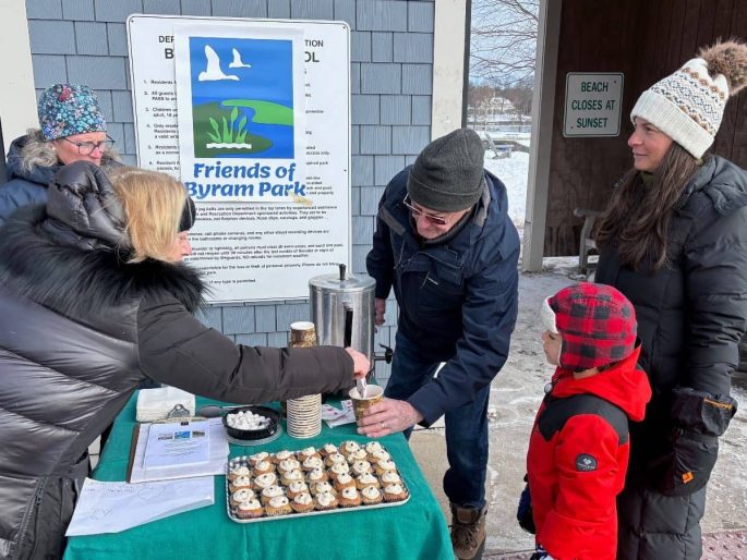 The Friends of Byram Park held their annual Hot Chocolate in the Park event on Jan. 31 at Byram Park. Volunteers provided hot chocolate and pastries and shared information about their work to maintain and improve park areas in western Greenwich. Kevin Allmashy, the park concessionaire and owner of the Standby Luncheonette in Port Chester, supplied the refreshments.