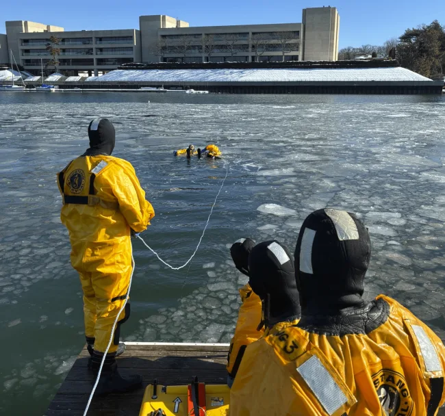 The Greenwich Fire Department conducted cold water rescue training at Grass Island during sustained freezing temperatures that created icy conditions on Greenwich Harbor. Firefighters reviewed specialized rescue equipment and completed hands-on rescue drills in the water. The training was designed to prepare crews to respond quickly and safely to cold water emergencies.