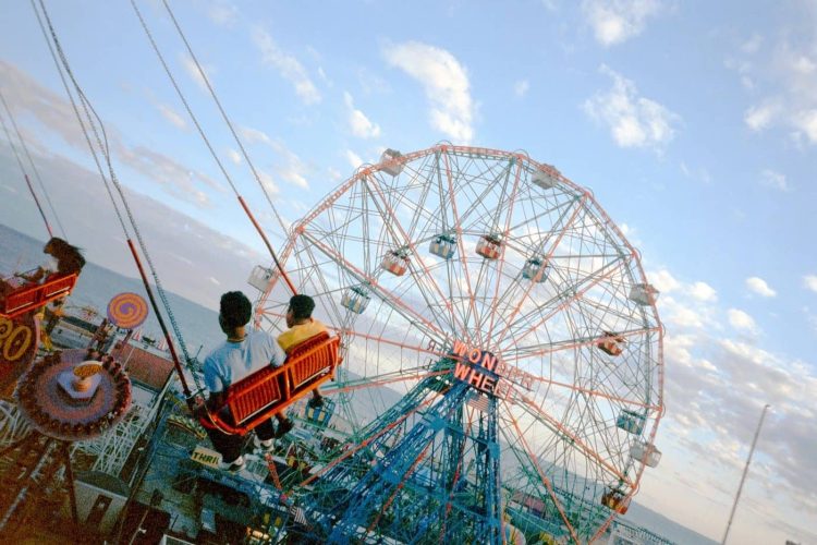 Senior Adam Shin also received an Honorable Mention for his photography portfolio, “Why Does Time Fly?” A standout image captures two figures seated on a swing ride suspended above the Wonder Wheel at Coney Island. The tilted horizon and radiating spokes of the Ferris wheel convey motion and immediacy. Shin’s portfolio examines fleeting moments and the visual language of movement.