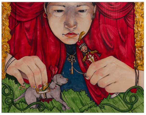 In Drawing, junior Eleanor Kim received an Honorable Mention for Toys for Girls. The piece presents a girl framed by rich red drapery, manipulating miniature figures—a toy soldier and a small dog—within a carefully rendered environment. Decorative borders and detailed textures create a theatrical atmosphere. The drawing explores themes of expectation and narrative through intimate gesture and composition.