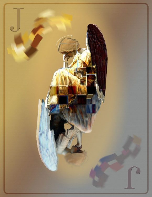 Yihan Shao, also Grade 11, received a Gold Key in Digital Painting, Drawing & Collage for Jack of Light and Shadow. The composition centers on a seated angelic figure fractured by geometric blocks of color. Classical imagery merges with digital manipulation, creating a layered interplay of shadow, illumination, and abstraction. Large serif letters hover within the composition, suggesting symbolic language woven into the visual field. The piece reflects both technical fluency and conceptual ambition, hallmarks of strong digital practice.