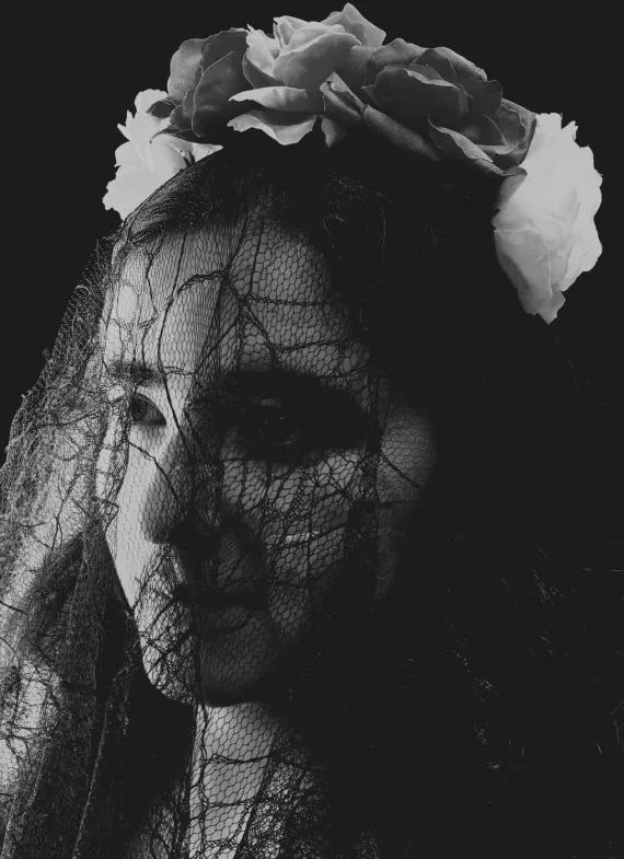 Senior Alexa Loera earned an Honorable Mention for her photography portfolio, “Dualidad.” One featured image portrays a young woman crowned with flowers, her face partially veiled. The black-and-white treatment heightens contrast and mood, emphasizing the interplay of concealment and revelation. Across the portfolio, Loera investigates dual identity and cultural symbolism through portraiture.