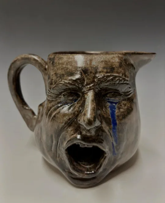 Luca Portolano, Grade 11, earned a Gold Key in Ceramics and Glass for Breaking Point, a sculptural vessel that transforms functional pottery into a charged emotional study. The piece features a human face contorted in a cry, a vivid streak of blue glaze cutting down one cheek. The form balances craftsmanship and intensity; the mouth of the pitcher becomes the open expression itself. The work demonstrates advanced control of glazing and structure while conveying psychological weight through material.
