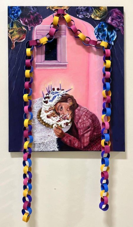 Senior Layla Morris earned a Silver Key in Mixed Media for “And Eat it Too.” The artwork combines painting and dimensional elements, including a suspended paper chain that extends beyond the canvas. The central image depicts a young girl resting beside a frosted birthday cake, her expression contemplative. The addition of three-dimensional materials invites viewers to consider the passage of time and the rituals associated with childhood milestones.