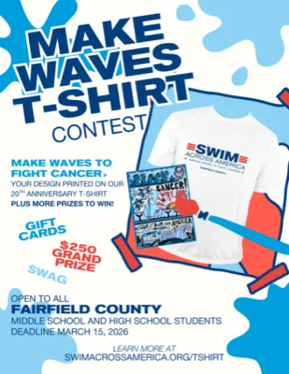 Swim Across America – Fairfield County is celebrating 20 years of making waves in the fight against cancer with a fun Make Waves T-Shirt Design Contest for Fairfield County, Connecticut, middle and high school students. Teens have the opportunity to design an impactful and meaningful t-shirt design that will be featured on the back of the commemorative 20th Anniversary t-shirt, worn by swimmers, volunteers, and supporters throughout the 2026 season. The annual swim will take place on Saturday, June 20, 2026, at 96 Cummings Point Road in Stamford, Connecticut, and attracts hundreds of swimmers, volunteers, boaters, kayakers, paddle boarders and spectators.