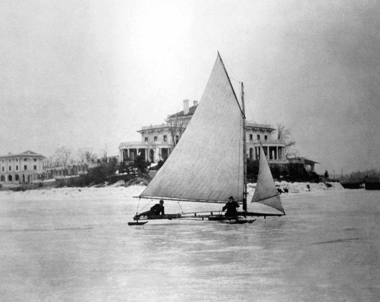 Another remarkable year was 1934. William Erdmann, captain of the Island Beach ferry for thirty years, was interviewed in 1975 by OHP volunteer Marge Curtis. As a young man of 24, he recalled that “in 1934 we had a particularly severe winter. It was a combination of real cold weather and no wind, so the Sound was frozen over.” The ice “got real thick at that time. I skated out to the island Ice boating in Greenwich Harbor. Courtesy of Greenwich Library. (Island Beach) to visit the Metzger family who were very low on food supplies. I thought to myself, ‘Boy, I’m a dope for ever being out here on skates all alone.’”