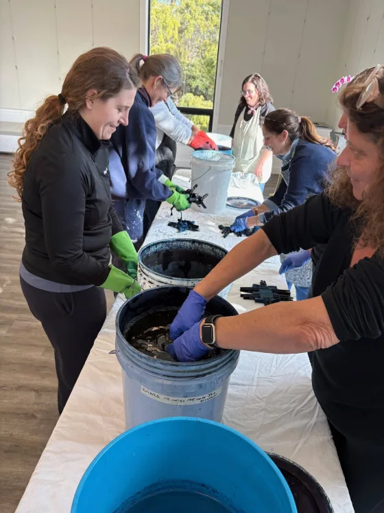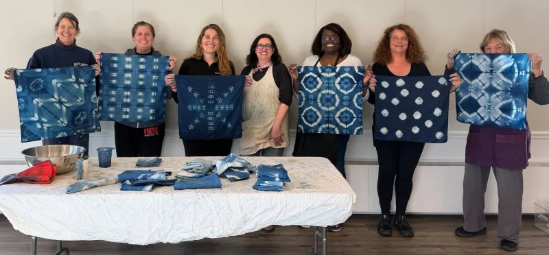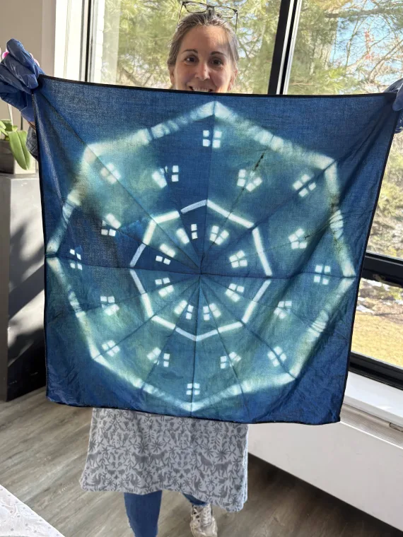 By 3:15 Gilbert’s indigo dye workshop was coming to a close, as each participant began to unfold their indigo designed bandanas. There were spider web designs, triangles, squares, snowflakes, and lots of dots. “I love it, I love it!” shouted one of the six indigo dye first time designers, holding her creation up for all to see.