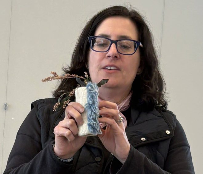 Gilbert, based in Guilford with her Tocco Studio – “creating naturally dyed fiber art and home goods,” brought her enthusiasm with her. Tocco means in Italian ‘to touch’ as her goods are “very tactile.” She grows that indigo blue plant known also as Japanese indigo and she’s been to that Japanese island of Shikoku, “where all of the indigo is grown.” “They create a kind of fermented leaf… like a compost, and it takes them four months to process the indigo… they’re turning the leaves and have these enormous batches of leaves. It’s quite labor intensive… they’re pounding it, they pulverize the leaves, then roll these little balls and bake them.” All of that to get that indigo powder.