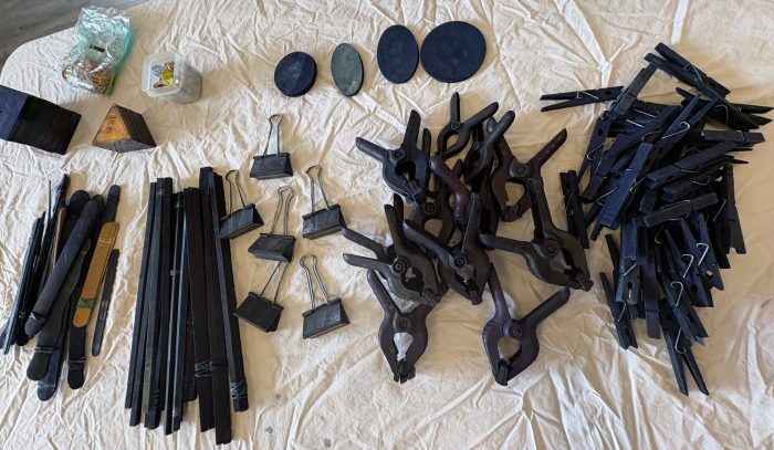 Spread across a table before her was an array of wooden tools of popsicle sticks, clothes pins, and metal clamps to employ upon a cloth to bring forth those designs. On another table sat a number of large, indigo-infused vats where those pinioned cloths, those bandanas would be dipped.