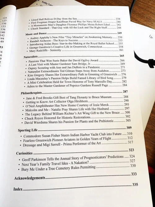 Yet the center of her work remains Greenwich. The book reflects that focus. It is arranged in 12 categories, “from Art to Sporting Life,” with a final section titled “Curiosity.” The people in it are drawn from lived encounters, conversations, and years of reporting.