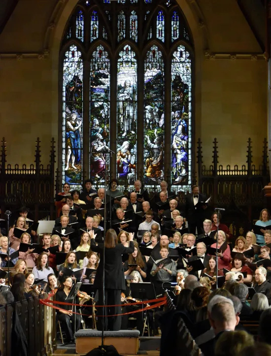 The first line to be sung by the Choral Society and 45 Vassar College choristers indeed began with Mathes’ slight alteration of “Ah love, let us sing to one another,” from the original “Ah love, let us be true to one another.” Other lines included, “Sing a melody of renewal, a harmony of grace; The hope of singing together written on every face,” with that ending line of “Ah love, let us sing to one another.”