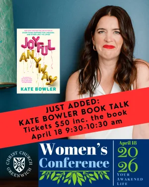 Christ Church Greenwich has added additional seating for a standalone book talk by New York Times bestselling author Kate Bowler, scheduled for Saturday, April 18, at 9:30 a.m., following strong interest in the event.