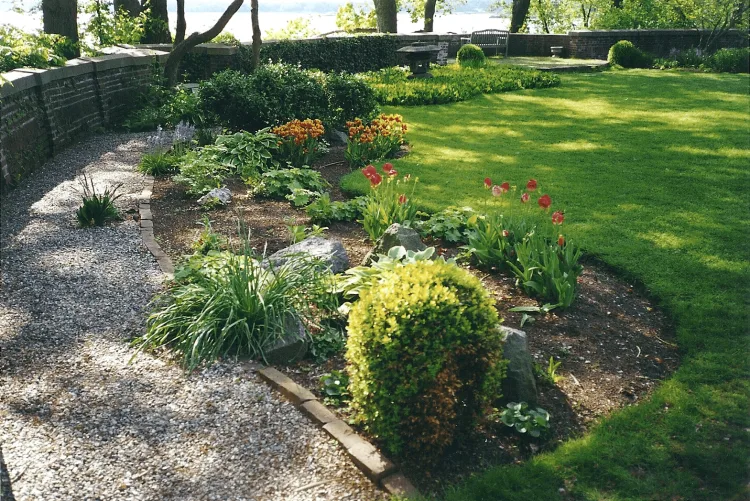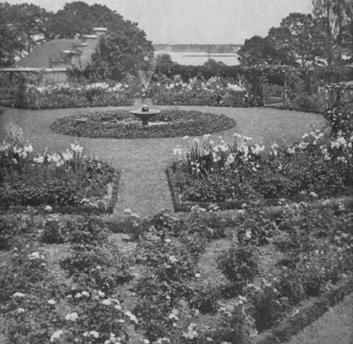 A historic image provided with the event materials (at right) identifies the site as the original design of the Seaside Garden by Marian Cruger Coffin for the J. Kennedy Tod estate, now Tod’s Point, and cites its publication in House & Garden, volume 37, page 35, in March 1920. The image shows the garden in its earlier form, with a circular center feature, planted borders and the water beyond, making clear how closely the design was tied to the shoreline setting.